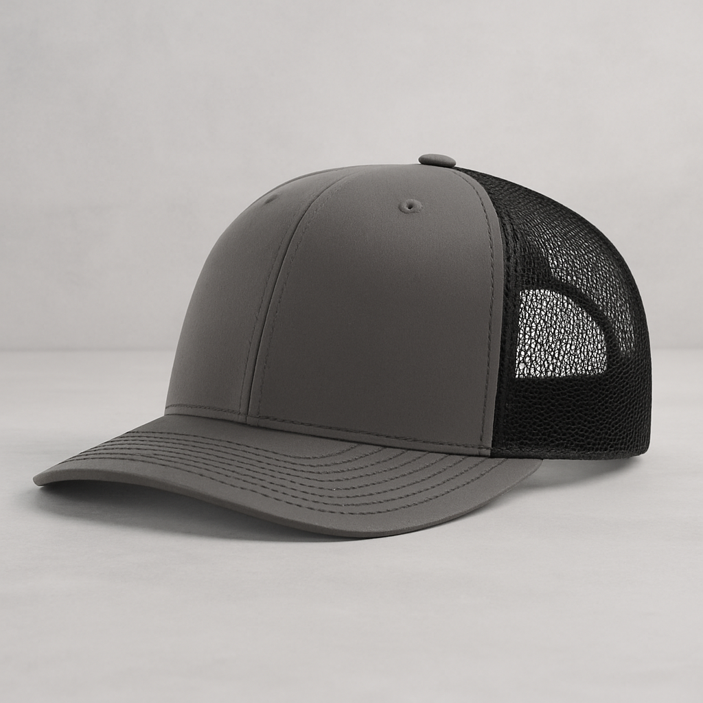Classic trucker cap with a structured gray front and breathable black mesh back. Features a curved brim, clean stitching, and a versatile design perfect for everyday wear.